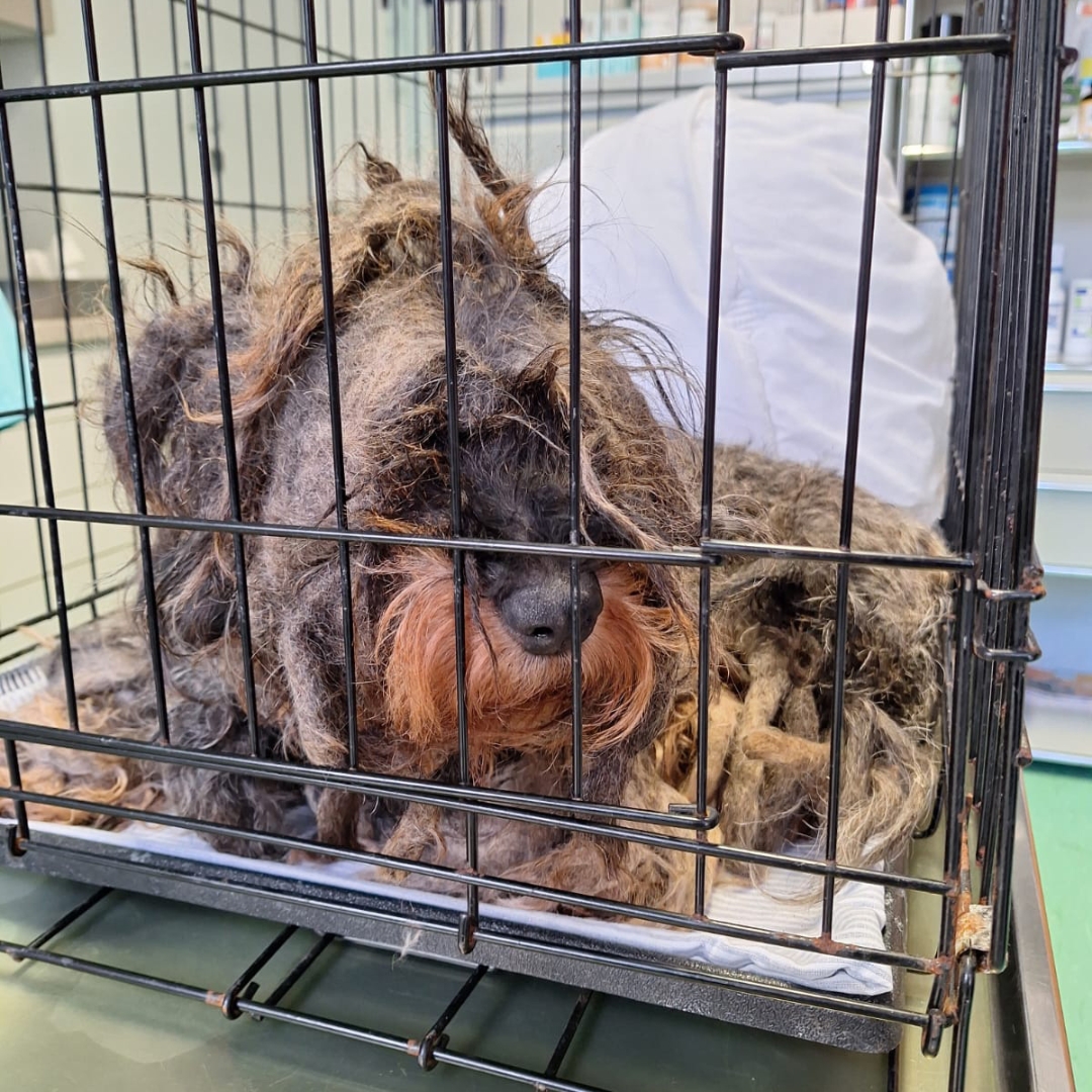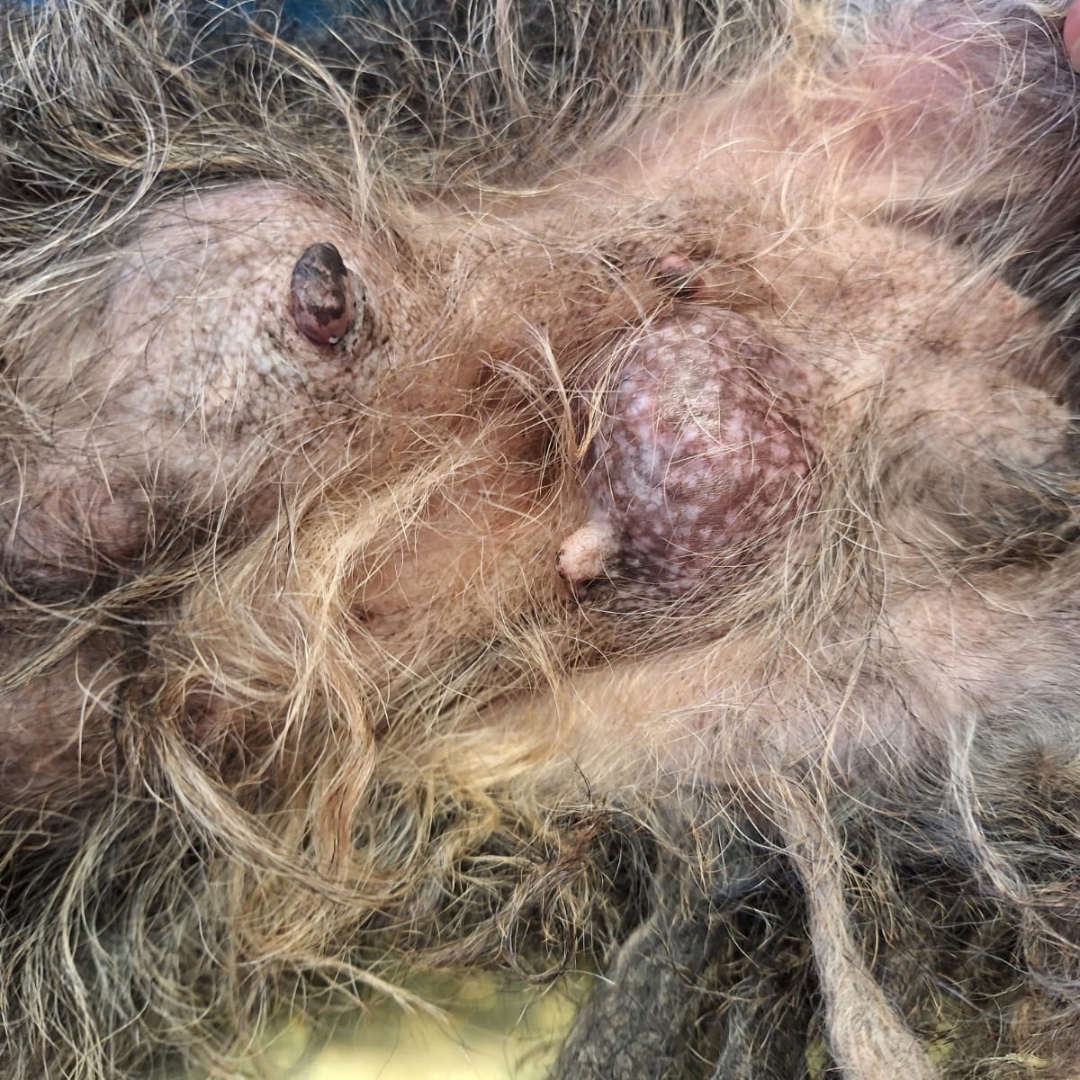 Das ist Käthe, eine kleine Dackeldame, die eine unglaubliche Geschichte hinter sich hat. Als sie in unser Tierheim kam, war sie kaum wiederzuerkennen: Ihr Fell war völlig verfilzt und schmutzig, sie roch erbärmlich und ihre Haut war von Entzündungen gezeichnet. Doch das Schlimmste entdeckten wir erst nach dem Scheren: zwei große Tumore an ihrer Gesäugeleiste, jeder so groß wie ein Gänse-Ei.