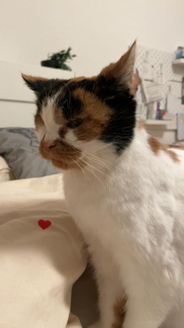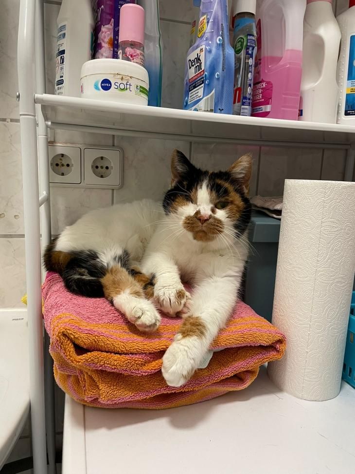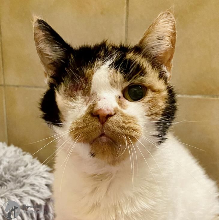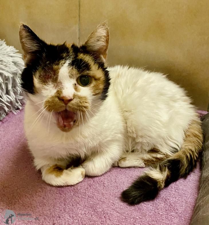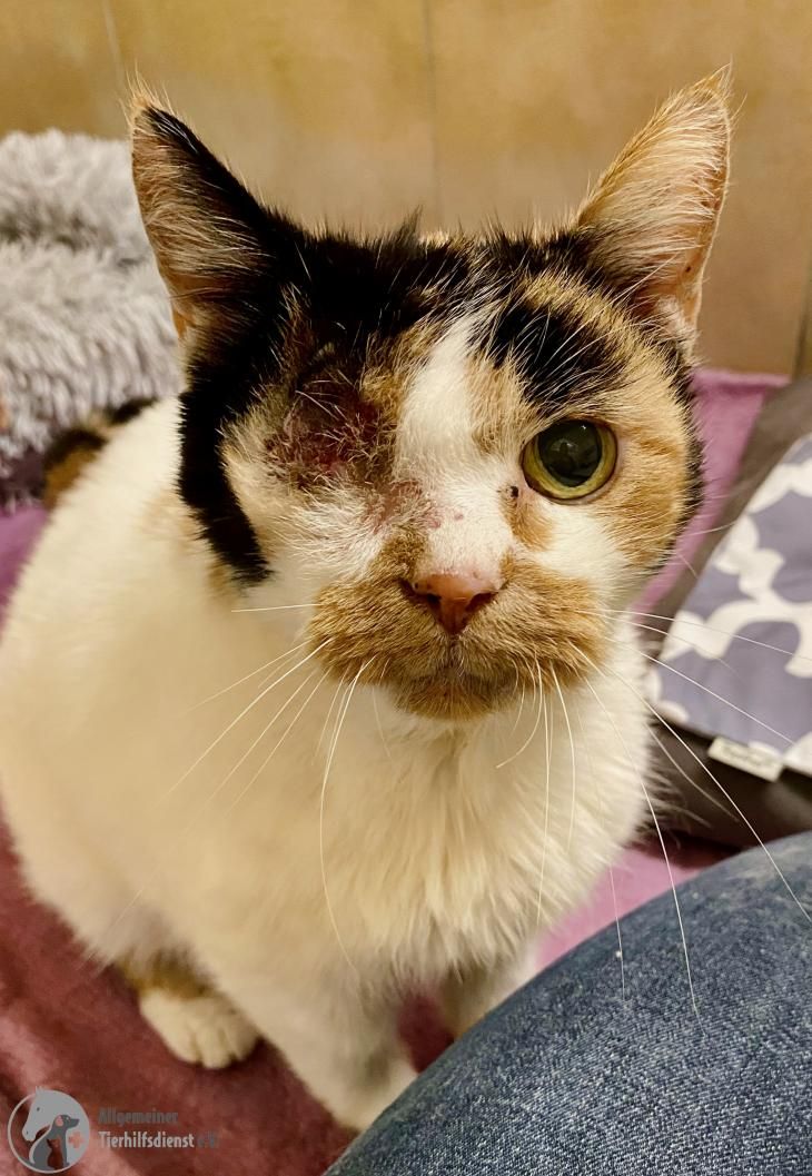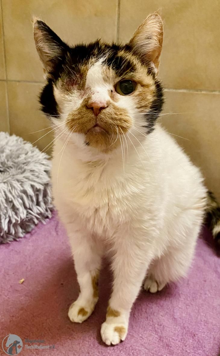 Erna war bisher immer eine Wohnungskatze, doch als ihr Frauchen plötzlich verstarb, gab es niemanden mehr, der sich um sie kümmern konnte und so wurde sie einfach vor die Tür gesetzt. Schließlich kam die alte Dame zu uns und damit hatte sie großes Glück…wie sich bei unserem Tierarzt herausstellte, waren ihre Ohren voller Milben, ihr Zahnfleisch hochgradig entzündet und im rechten Auge hatte sich die Linse verlagert (Linsenluxation). Leider musste dieses Auge entfernt werden und wir sind sehr froh darüber, dass sie die Op gut überstanden hat.