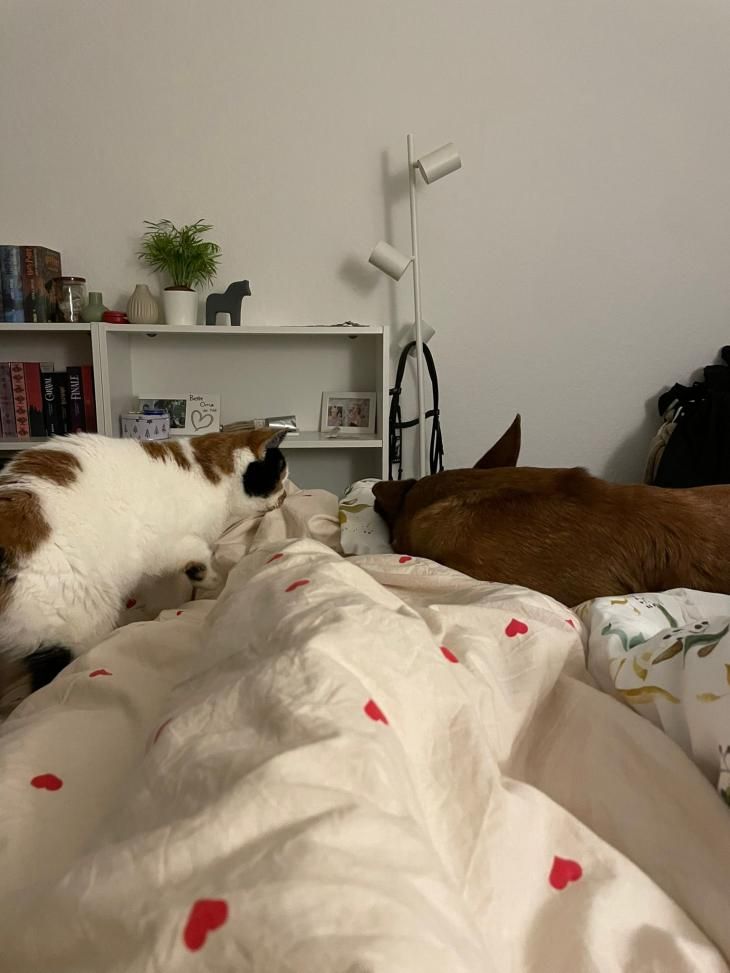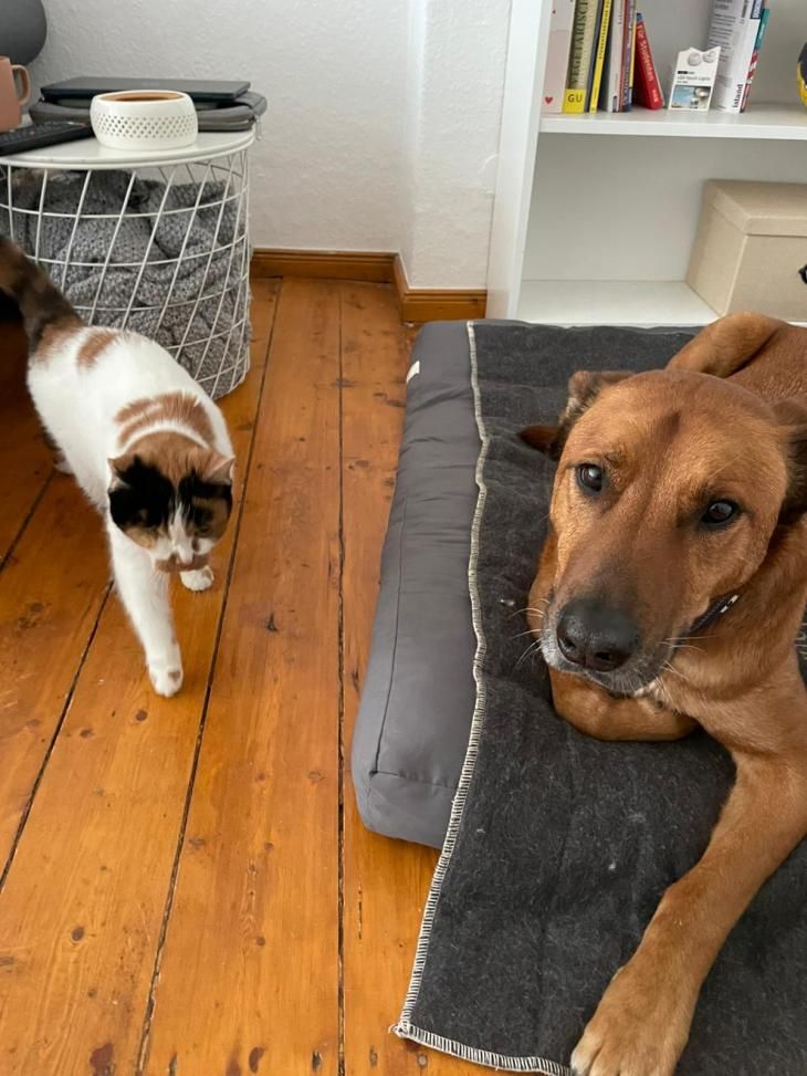 Erna lebt jetzt in Magdeburg. Zusammen mit einem wirklich großen Hund und wer hätte es gedacht? Erna schlendert an ihm vorbei – ein kurzes, lässiges leises Fauchen – und zack – waren die Fronten geklärt. Hundi ist wirklich zauberhaft und geht gut mit ihr um, akzeptiert den gewünschten Abstand.